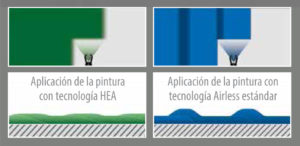 HEA permite al equipo trabajar a menor presión que un equipo airless tradicional, entre 55 a 110 bar. Esto es posible gracias al diseño de las boquillas HEA que tienen una precámara de atomización, por lo tanto, no es necesario presiones altas como, si lo es, en el caso de equipos airless tradicionales.